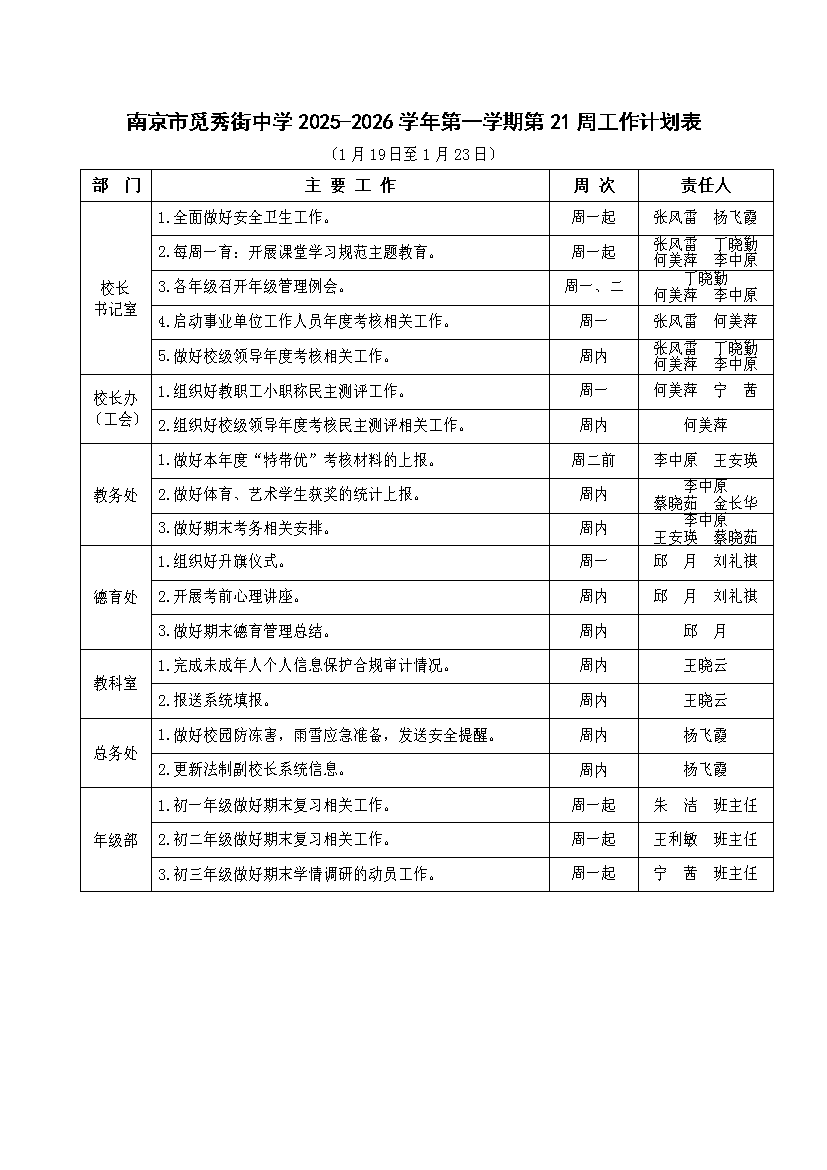 南京市觅秀街中学2025-2026学年第一学期第21周工作计划表