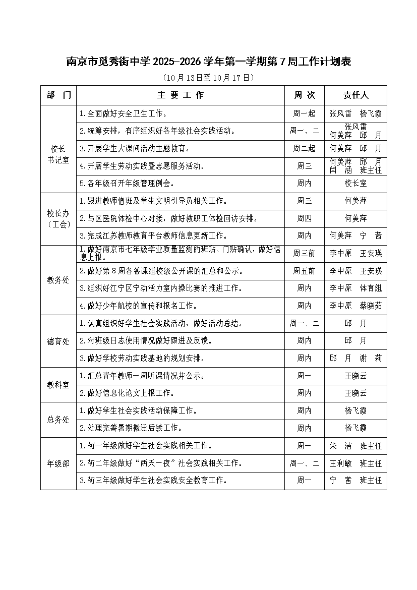 南京市觅秀街中学2025-2026学年第一学期第7周工作计划表