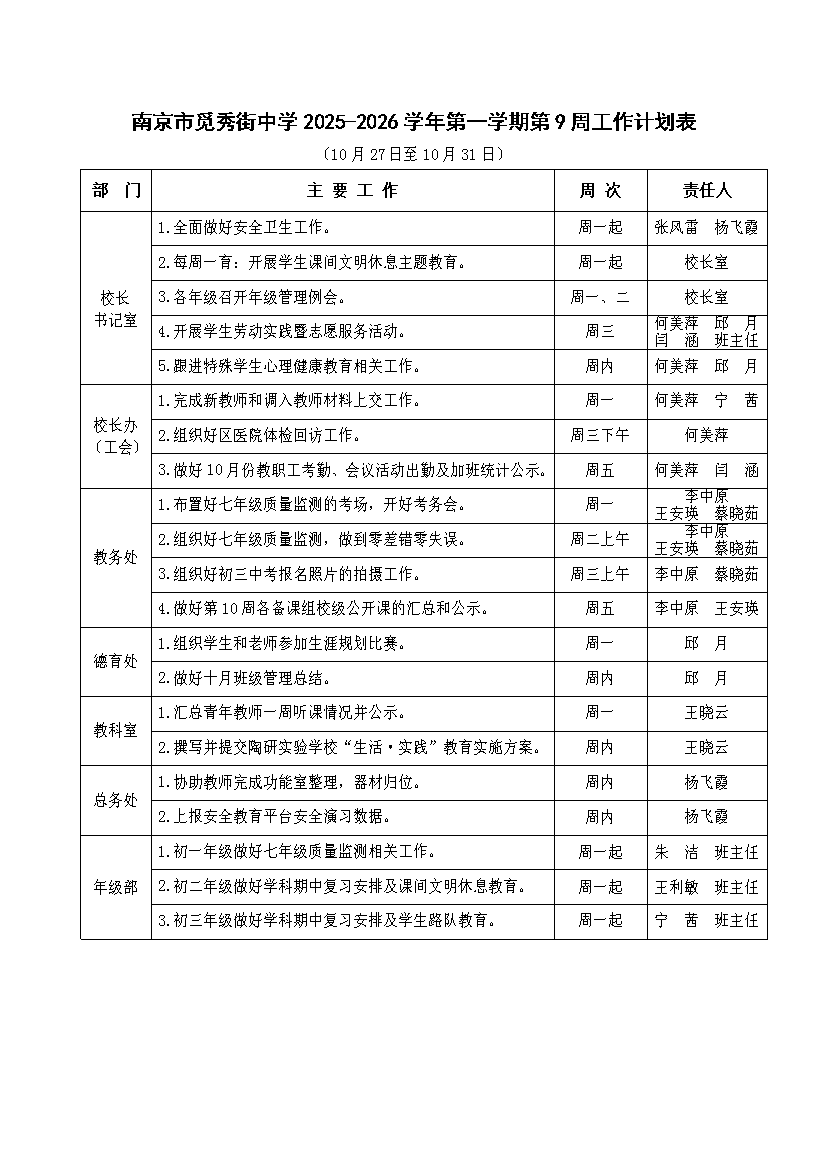 南京市觅秀街中学2025-2026学年第一学期第9周工作计划表