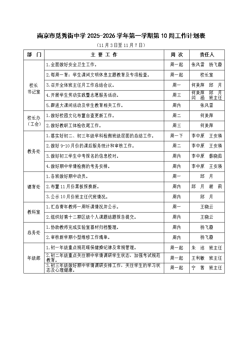 南京市觅秀街中学2025-2026学年第一学期第10周工作计划表