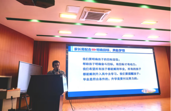 随后,张风雷校长作总结发言。张校长高屋建瓴,从“形势、目标、责任、协作”四个维度,阐述了家校同心的重要性。他首先肯定了初三年级全体师生在前一阶段付出的努力和取得的进步,并指出中考是学生人生旅途中的重要一站,需要学校、家庭和学生三方倾注全力。张校长强调,面对不断优化的中考要求,学校将持续加大支持力度,配强师资,优化管理,提供最坚实的保障。他呼吁全体家长要对学校充满信心,对老师充分信任,对孩子持续鼓励,将关注点从单一的分数转移到孩子的全面发展与健康成长上。张校长特别指出,“同心协力”贵在行动,希望家长们积极参与到家校共育的各个环节中来,理解并配合学校的各项安排,及时反馈意见建议,共同构筑起支持孩子冲刺中考的坚强后盾。“我们的目标只有一个,那就是尽我们所能,助力孩子们梦想成真,奔赴锦绣前程。”张校长深情而有力的话语,引起了在场家长的强烈共鸣。