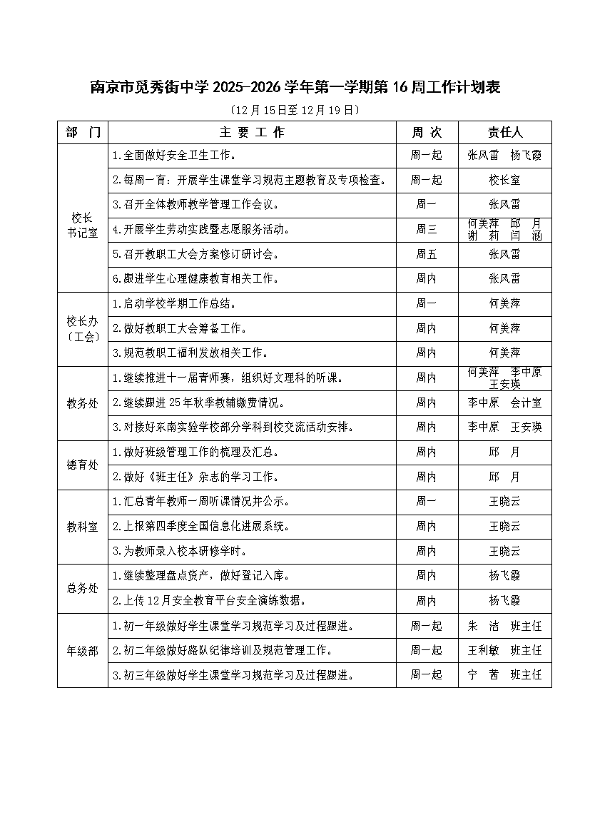 南京市觅秀街中学2025-2026学年第一学期第15周工作计划表