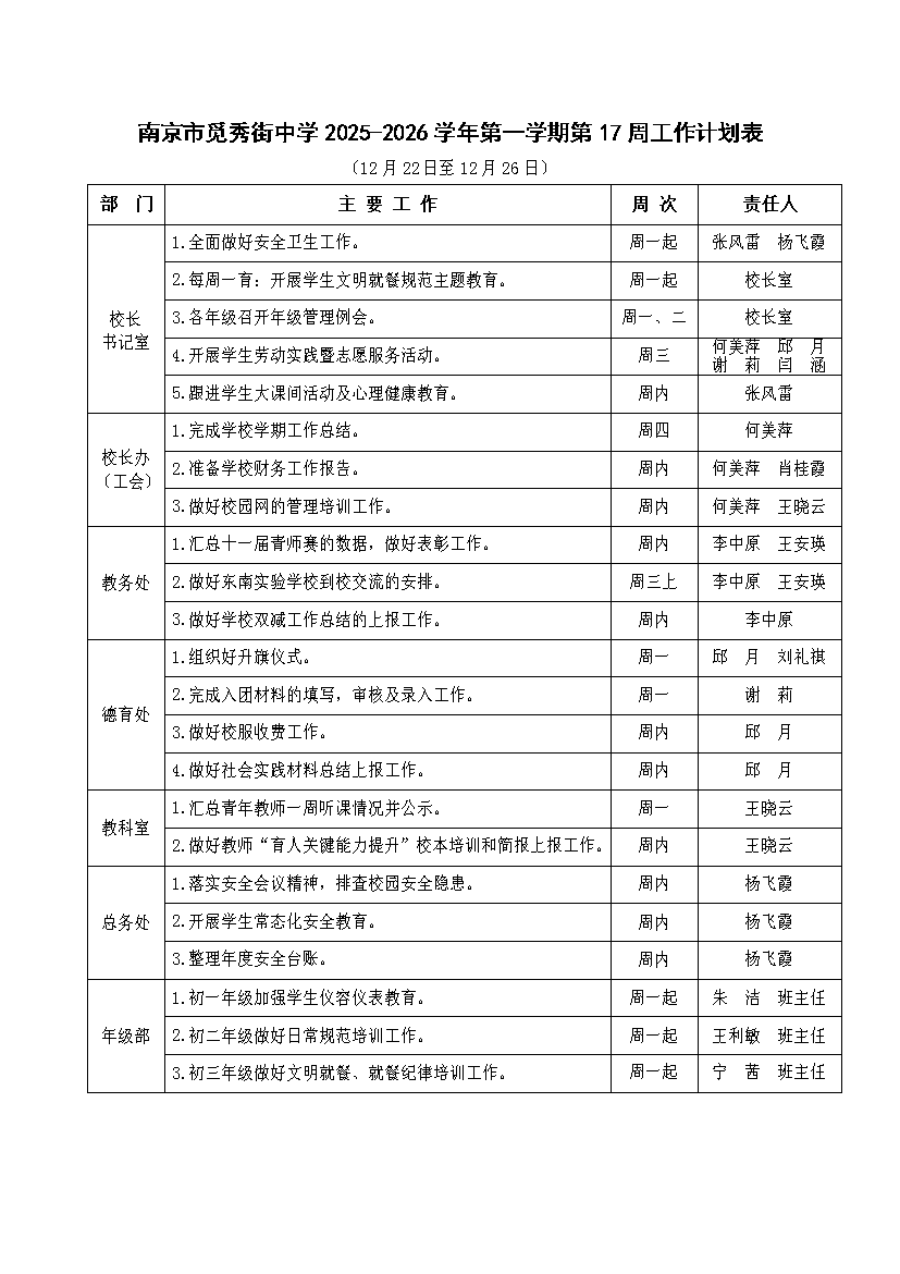 南京市觅秀街中学2025-2026学年第一学期第17周工作计划表